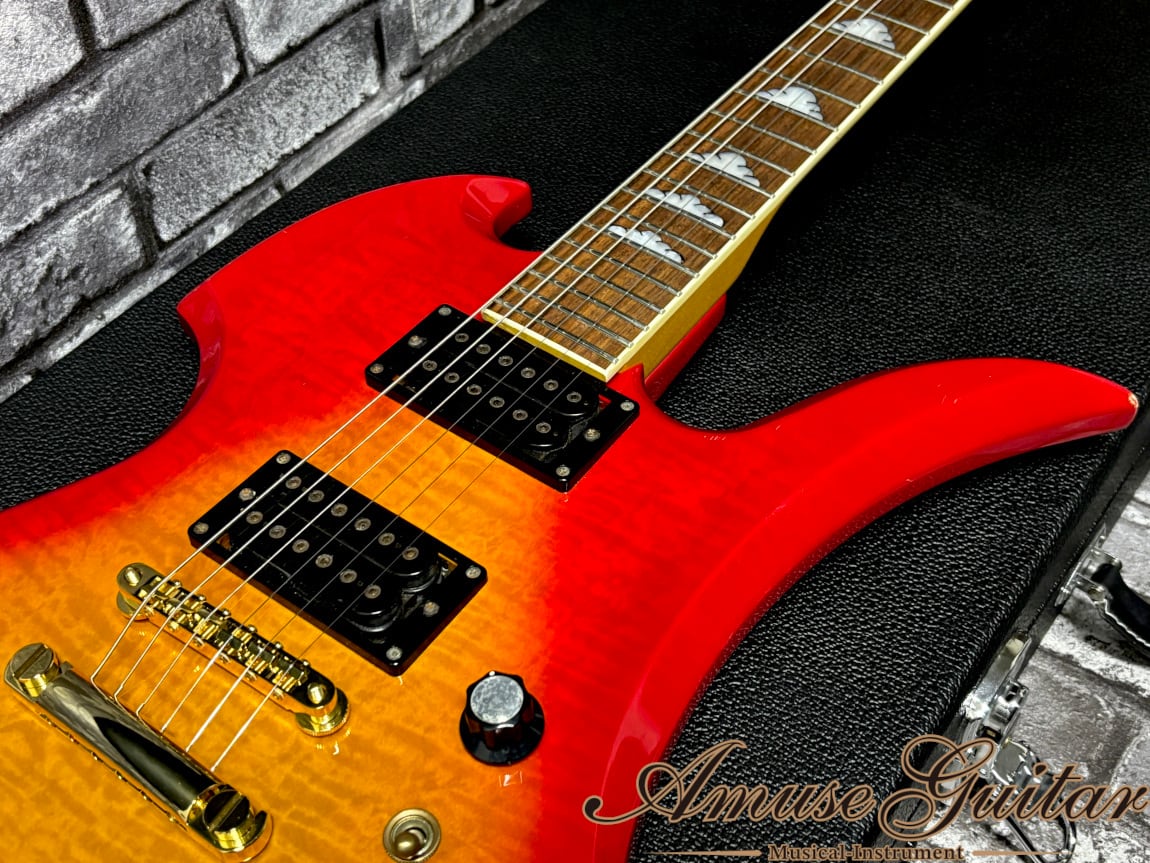 今回ご紹介させていただきますのは、1990年代半ばよりフェルナンデスのカタログにラインナップされた【MG-85X】です(Burny=FERNANDES製作トラディショナルスタイルモデルの別名ブランド)。当時社会現象レベルの人気を誇り、X JAPANやソロ活動にてギターヒーローの地位を確立していたhide氏のシグネイチャーモデルとなります。B.C.Rich社Mockingbirdを基にフェルナンデス社でアレンジを加えられた仕様となっており、扱いやすく実用的な仕上がりとなっています。