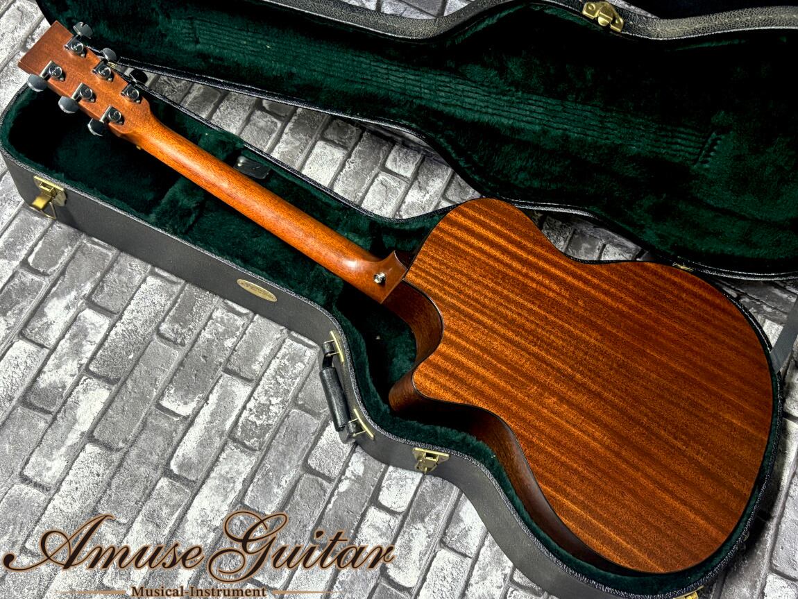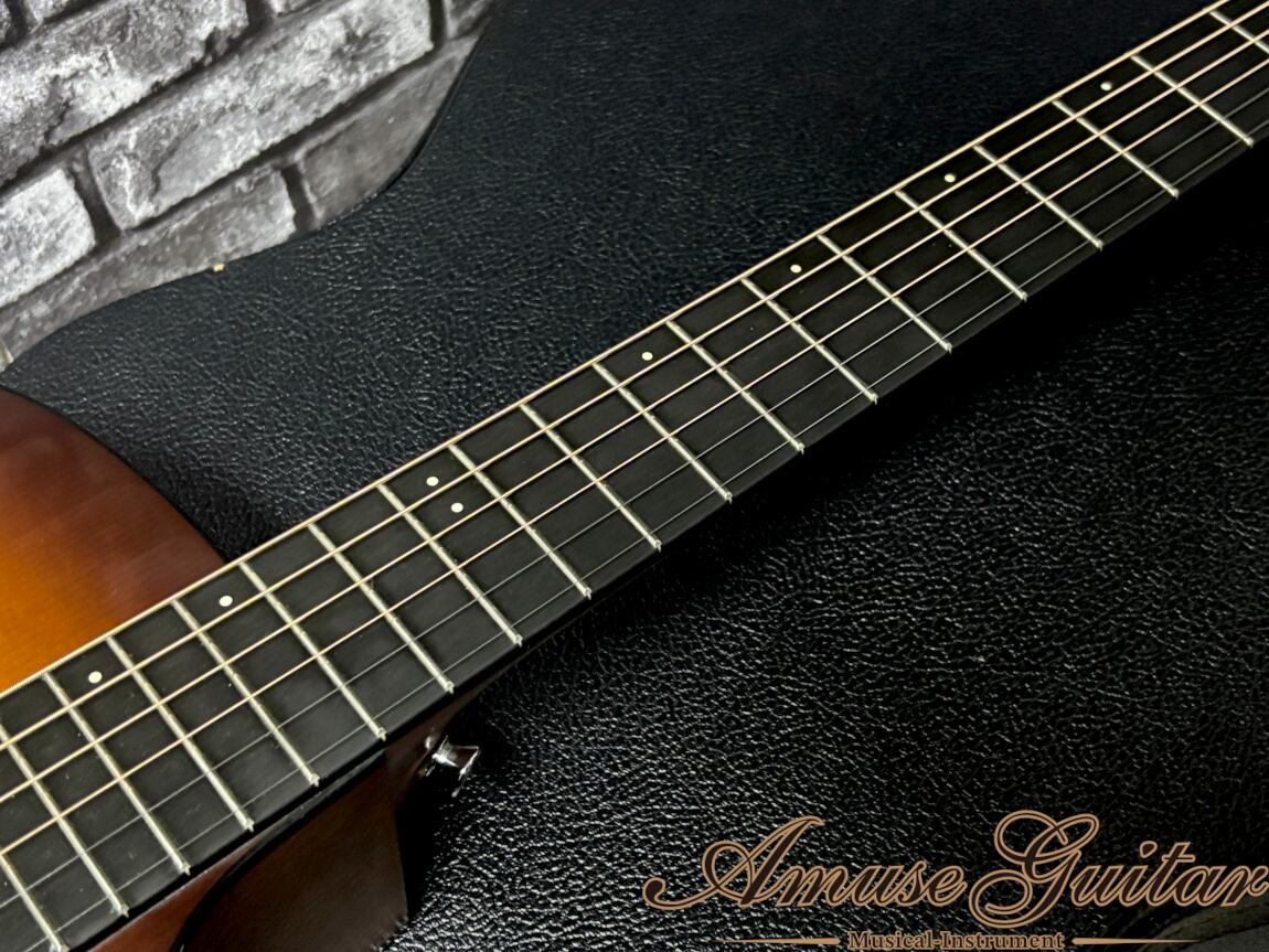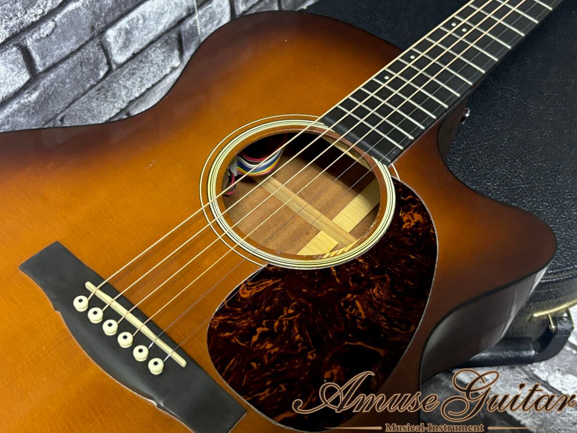 こちらのスペックですが、トップは単板のスプルース。サイド&バックは単板のサペリ。ネック材は選定されたセレクトハードウッドに、指板(&ブリッジ)はリッチライトとなっており優れた剛性も魅力です。ホワイトコーリアンナットは約44mm、ネックシェイプは薄めで扱いやすい“High Performance Taper”、20フレットのハイポジションもカッタウェイデザインとなっており、幅広い演奏性にもマッチ致します。ブレーシングパターンはX。その他としましては、マーチンロゴ入りオリジナルペグ、ボディにはブラックのバインディング、べっ甲柄ピックガードなどが挙げられます。