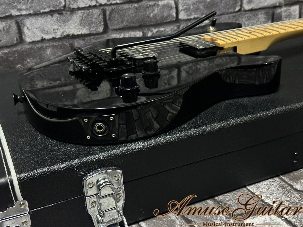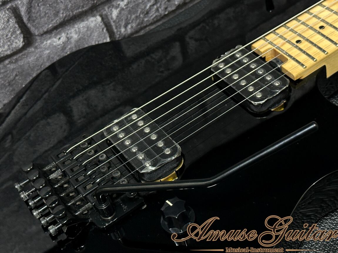 こちらのスペックは、エディといえば!のバスウッドボディに、メイプルネック&指板のボルトオン構造です。定番かつ間違いのないソリッドブラックフィニッシュを採用。ジャンボフレットに12"-16"のコンパウンドラジアスを採用した薄めのネックはプレイアビリティも抜群。コントロールは1ヴォリューム、1トーン、3WAYピックアップセレクター。ブリッジにはEVHオリジナル刻印のFloyd Rose Specialを搭載で、激しいアーミングも可能でモダンなプレイでもバッチリとハマります。その他としてはネックエンドにホーイルトラスロッドを採用しており、ネック調整も容易に行えます。