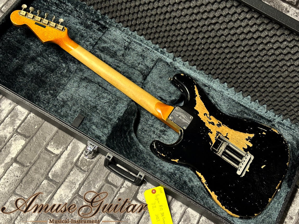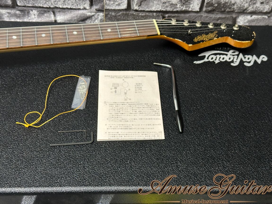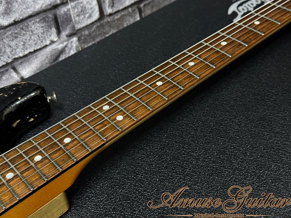 こちらのスペックですが、ボディにはアルダー、ネックは追い柾目木取りの厳選されたハードメイプル、指板はラウンド貼りのローズウッドの木材マテリアル。ロングスケール(648mm)、牛骨ナット(42mm)、9.5R、ナロートールタイプのフレットのボルトオン構造。ネックからボディ、そしてパーツ類に至る全てにエイジング加工が施されており、まるで1960年代のヴィンテージギターの様な塗装ウェザーチェック等が風格を放ちます。その他は基本的にSTスペックに則って製作されており、スモールヘッド、波型ストリングガイド、11点止め3Pブラックピックガード、GOTOHクルーソンタイプ6連ペグ(GOTOH SDS510-05M H.A.P.M)、6点止めシンクロナイズドトレモロ、ヴィンテージスペックを余すことなく再現した細部にもこだわりが光ります。