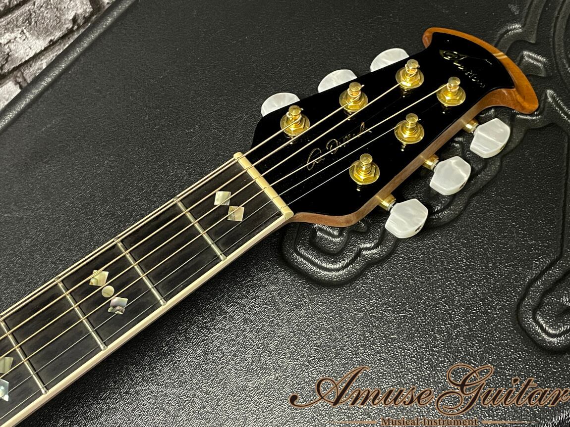 こちらのスペックですが、ボディトップにAAAグレードのシトカスプルースを単板にて採用。ネック材はメイプルとマホガニーのコンビネーション5P、指板&ブリッジには一目で上質な厳選材だとわかる漆黒のエボニーが採用された木材マテリアル。1-11/16" (42.8mm)のナット幅に、ロングスケール、ネックシェイプは薄めの握りやすいシェイビング。ボディバックにはオベーションの最大の特徴であるLyrachord(リコラード)素材を採用し、他ブランドには真似のできない音ヌケと、サウンドレンジの広さを担っています。Deep Bowlのボディサイズとなっており抱え込みやすい弾き心地も特徴です。ブリッジの彫刻も特徴で、アダマスシリーズを彷彿とさせる職人魂を感じます。サウンドホールはシンプルなクラシックスタイルを採用。その他としましては、パールボタンのオベーション刻印ペグ、インレイ&パーフリング&ボディバインディング部にアバロン、ダンロップロック対応ストラップピン等が挙げられます。