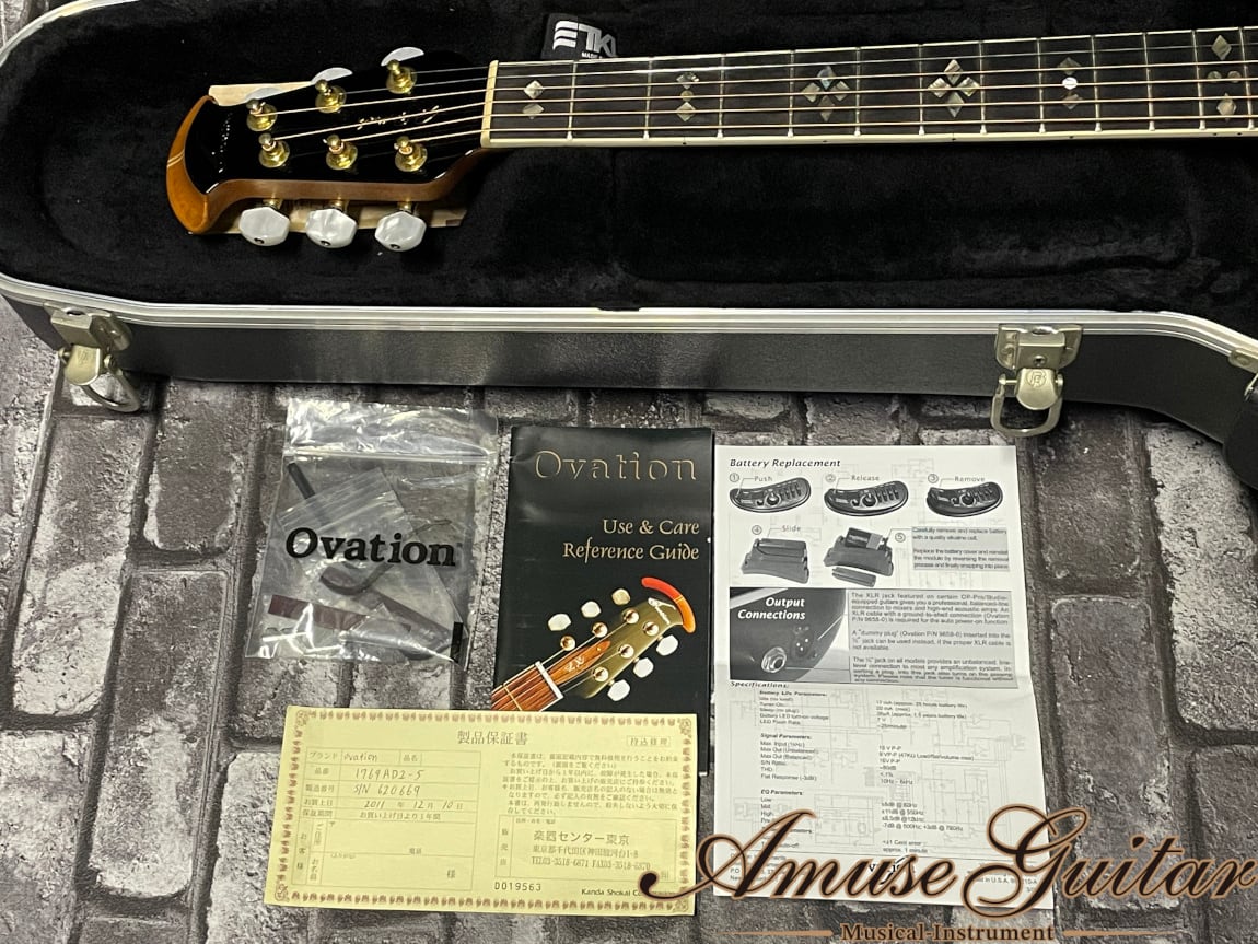 状態につきまして前所有者様が購入し、殆ど使用せず大切に保管されていた事が伺える状態良好なワンオーナー品。購入時からと思われる指板(1F付近)、ネックバインディングのクラック、ブリッジのクラック補修がございますが、その他は細かなスレがある程度。もちろん演奏面に問題のある個所は無く、ネック状態も良好でトラスロッドの余裕もシッカリと確認済み。フレットは約8割残り。付属品につきましては購入時発行保証書、冊子類(画像参照)、オベーションロゴ入りのオリジナルハードケースとなります。
