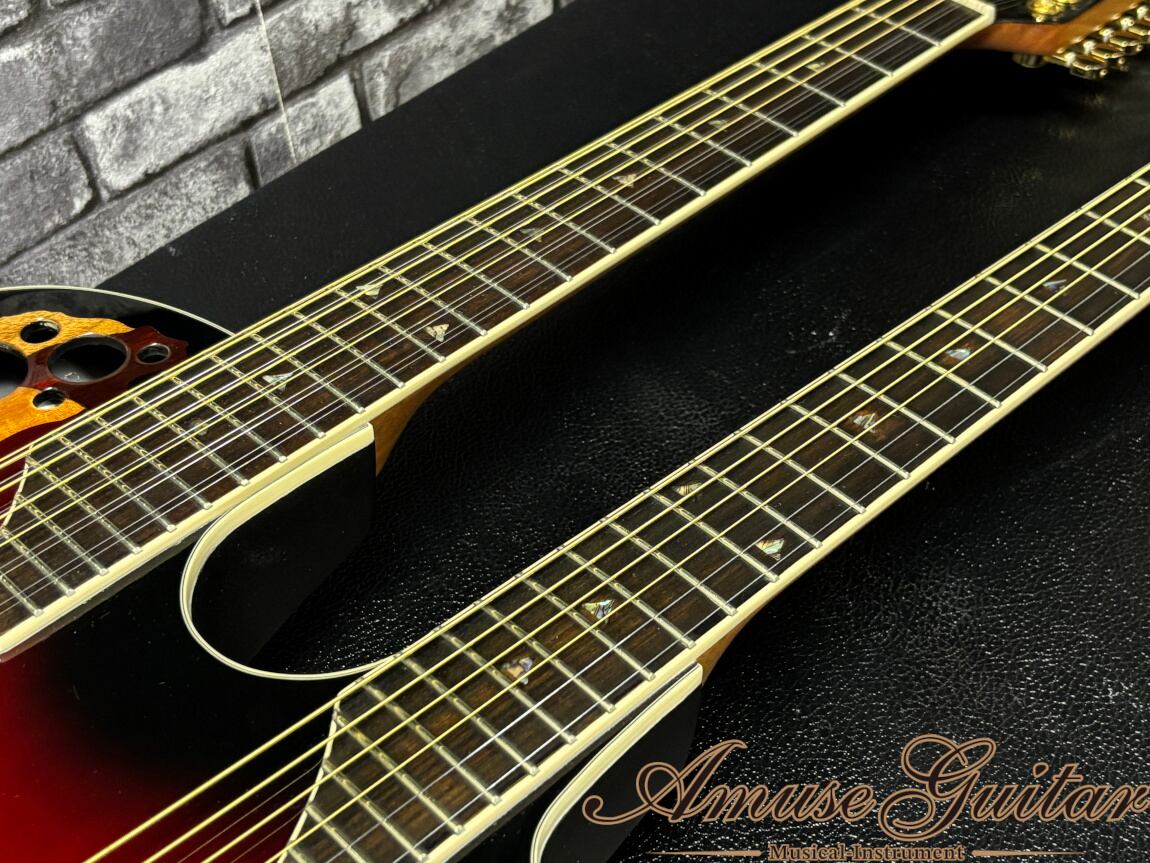今回ご紹介させていただきますのは、そのオヴェーションギターの中でも大変珍しいダブルネックの個体です。12弦+6弦ネックの組み合わせにより、名曲の数々を手軽に奏でられる逸品です。「オベーションのWネック」と言えば、日本でも特段需要がある” Wanted Dead or Alive”もこれがあればバッチリです。それに加え、今回入荷品は使用感をほぼ感じられない驚きの美品コンディション。新品購入をご検討されていた方にもお勧めできる今後お目にかかれないであろう要チェック品となります。