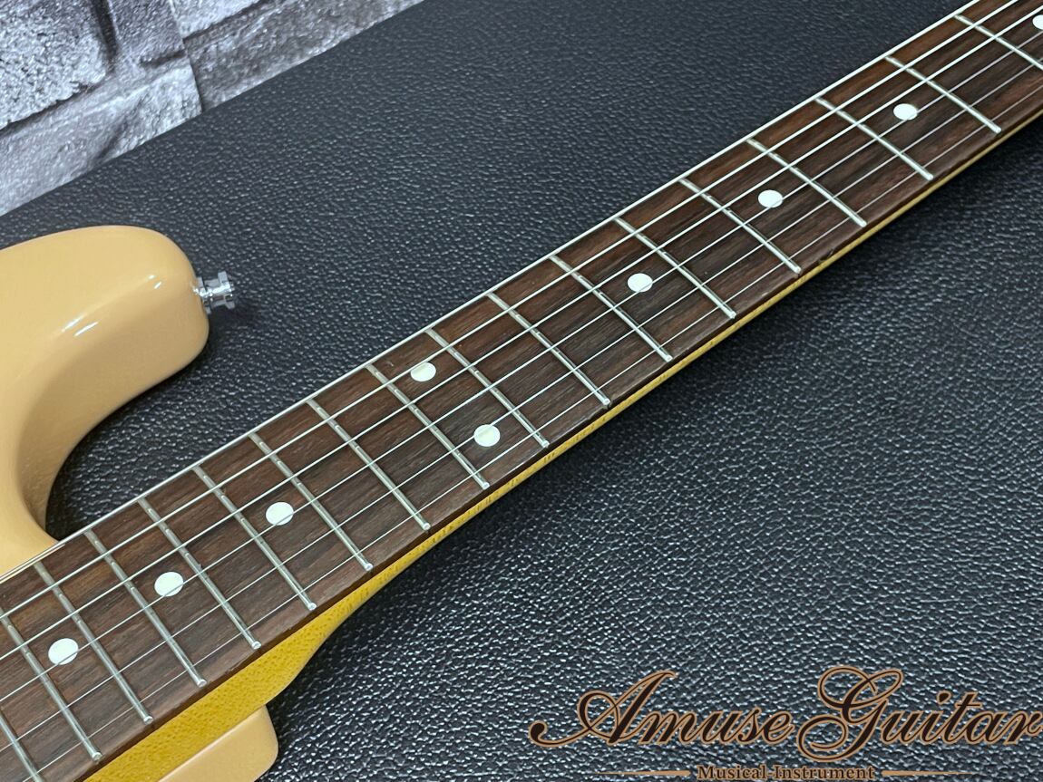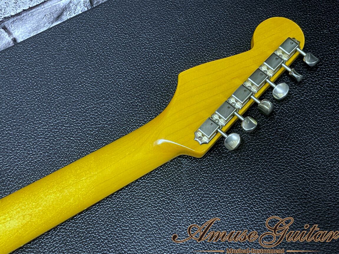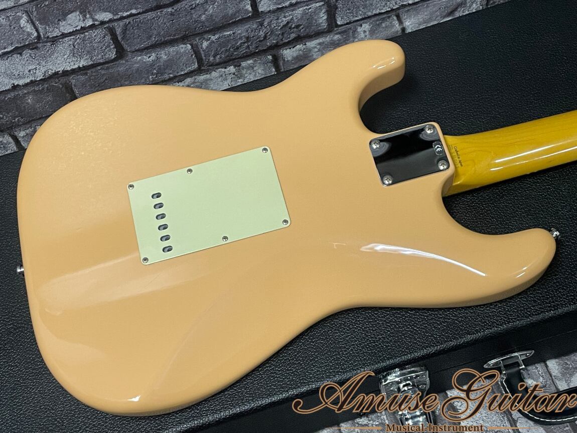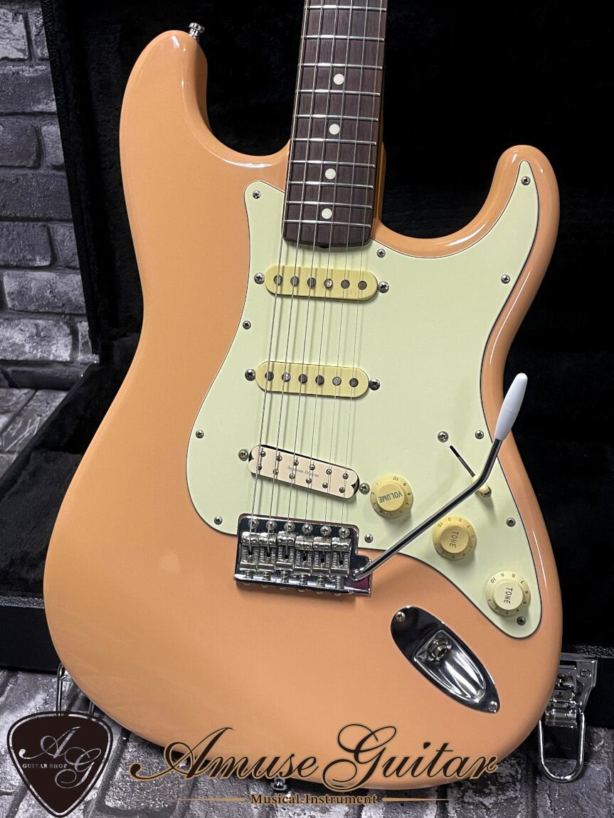 こちらのスペックは、ボディにアッシュ。ネックは板目取りのメイプルと、ブラウンの濃さが特徴のスラブ貼りローズウッド指板のストラト然とした木材マテリアル。ロングスケール、7.25R、ヴィンテージタイプフレット、握り心地の良いUシェイプネックのボルトオン構造。スモールヘッド、波型ガイド、41.5mmナット幅、11点止め3Pヴィンテージホワイトピックガード、クルーソンタイプ6連ペグ、6点止めシンクロナイズドトレモロにコマはFender刻印など、ヴィンテージスペックを余すことなく再現した細部にもこだわりが光ります。サウンド面でもヴィンテージライクな出力のシングルコイルピックアップはFender USA製となる“Texas Special Pickup”をセンター/フロントに搭載。ブライトで歯切れの良いキレと、スピード感がたまらないローミッドの余韻もたまらない王道ストラトトーンを奏でてくれます。クラシックロックはもちろん、絶対にどのジャンルでも外さない間違いないキャラクターは、誕生から半世紀以上愛され続ける理由でもあります。