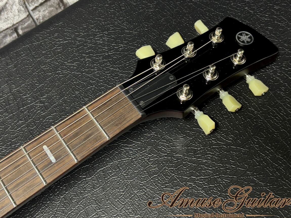 こちらのスペックですが、ボディにはチェンバード加工されたマホガニーをバックに、トップにはメイプル。ネックには3Pマホガニー+カーボンファイバー、指板はローズウッドとなる木材マテリアル。ミディアムスケール(628.6mm)、ナット幅41.5mm、22フレット(ステンレスジャンボ)、12Rのセットネック(ディープジョイント)構造。ボディにはモチーフにしたラスティーブラスチャコールカラーをグロス仕上げ&ゴールドのバインディングにてフィニッシュ。ネックバックはサテンフィニッシュ(ダークナチュラル)となっており、演奏性を意識した嬉しい仕上がり。ボディに採用されたチェンバード設計も音響解析プロセス「アコースティック・デザイン」を元に製作されており、科学的に豊かな鳴りを計算されています。笑ってしまうくらい生音が大きく、YAMAHAの技術力が体感できます。その他特徴としましては、ヘッドトップには高級感のあるYAMAHAエンブレムロゴ。ネック&ボディトップエッジにはバインディング仕上げに加え、ボディセンターにはレーシングストライプを採用し、ボディバランスを意識したシェイプながらかなり引き締まった印象を与えます。