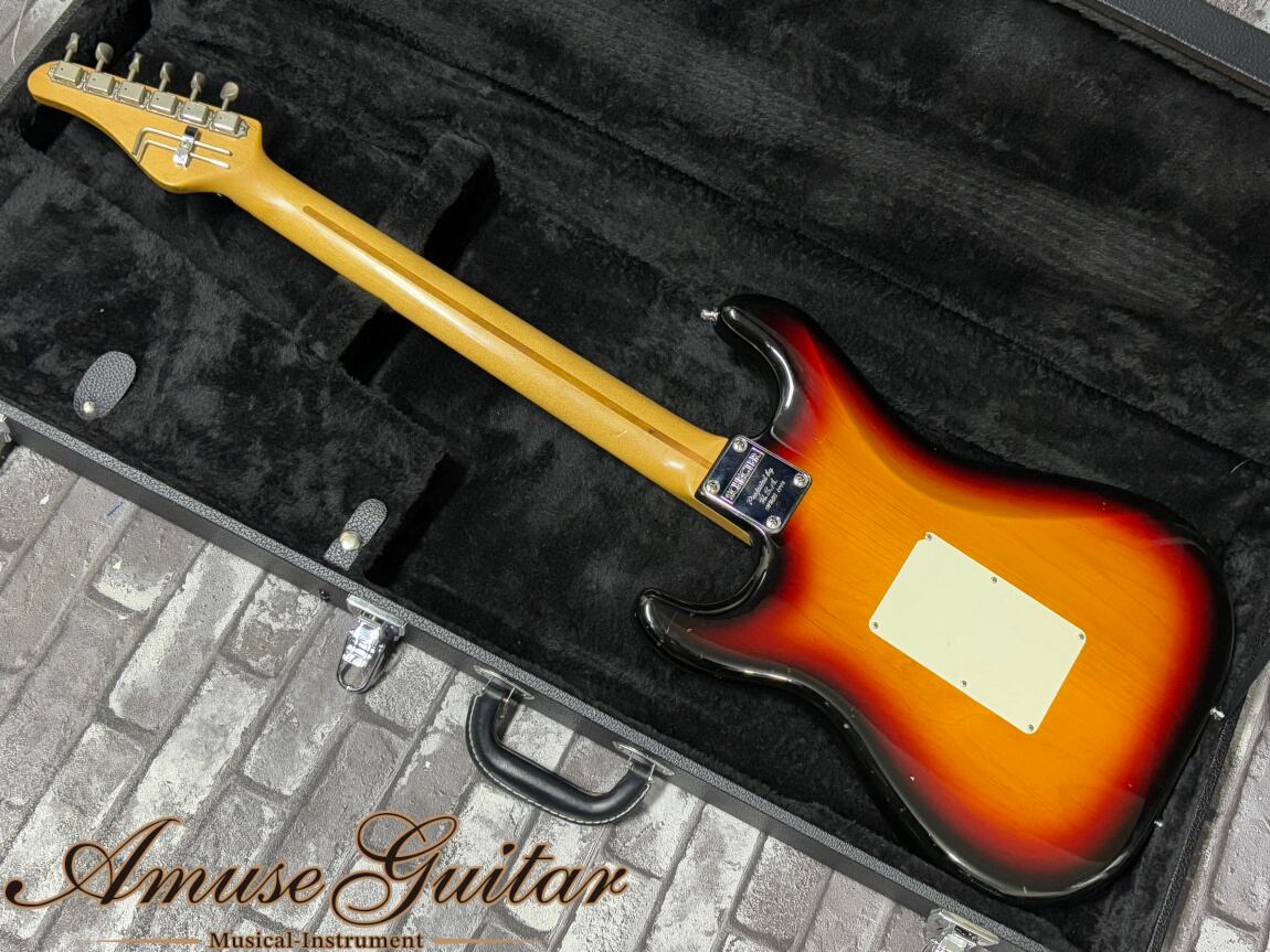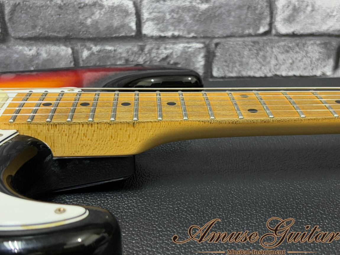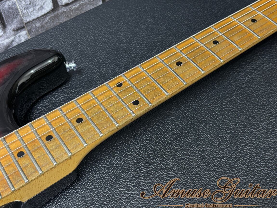 こちらの仕様ですが、アルダーボディ、板目取りとなるメイプル1Pネックというシンプルな木材マテリアル。薄めのCシェイプ、ロングスケール、22フレット、41.5mmナット幅のボルトオン構造です。その他はストラトキャスターを基本とした仕様となっており、クルーソンタイプペグ、ボディTOPの舟形ジャック。現代的なアレンジメントも取り入れられており、ネックジョイントはハイポジションアクセス向上のためのスラント加工が採用。