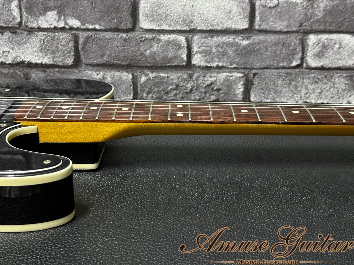 こちらのスペックはアルダーのボディ、ネックには上質なメイプル(板目)に、指板はローズウッドを採用した木材マテリアルです。その他としては、クルーソンタイプチューナー、波型ストリングガイド、ヴィンテージサイズフレットの21F仕様、指板ラディアスは7.25”、 8点留めとなる3Pブラックガード(換装)、3wayピックアップセレクター、マスターヴォリューム、マスタートーンのコントロール。アルミの溝有りサドルにシリアル刻印入りのブリッジ等が挙げられます。