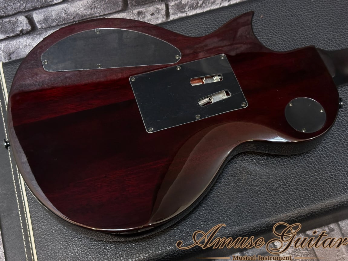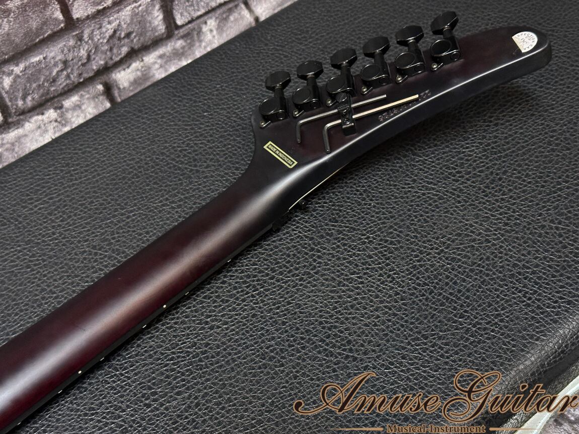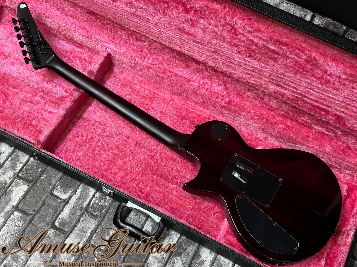 こちらのスペックですが、ボディにはメイプルトップ/マホガニーバックに、ネックはマホガニーと、レスポールタイプには珍しいメイプル指板の木材マテリアル。ロングスケール、約42mmナット幅、12R、ミディアムジャンボサイズの24フレット、どのフォームでも握りやすい薄めの” K-Speed SlimTaper C”を採用したセットネック構造。まず目に飛び込むリバース・バナナヘッドシェイプは、80’s HR/HMの流れを感じさせる最大の特徴でもあります。コントロールは2ヴォリューム/1トーンとなり、各ヴォリュームノブにはPush⇔Pull機能が搭載されており、各ピックアップのコイルタップを個別に設定する事も出来ます。