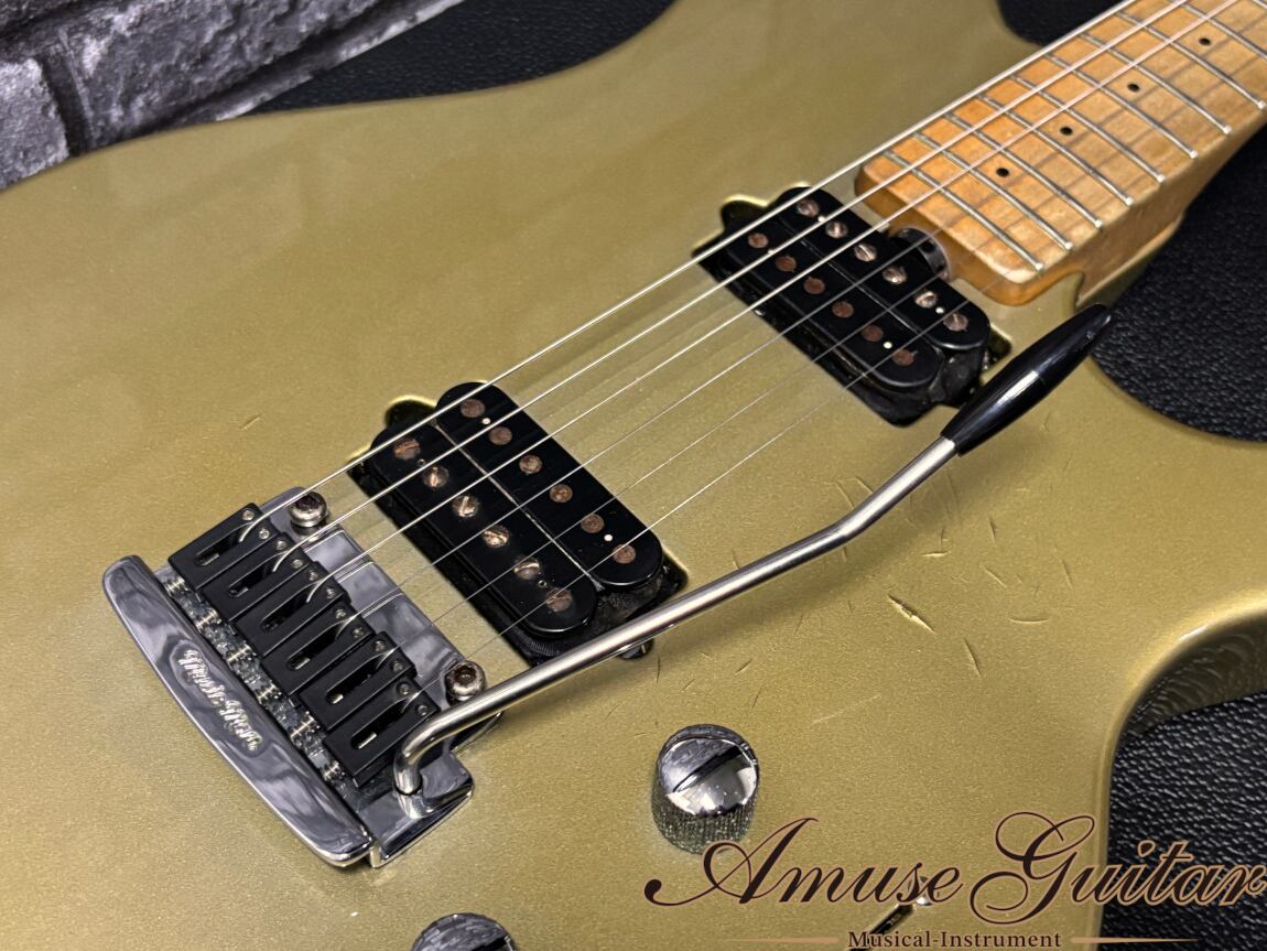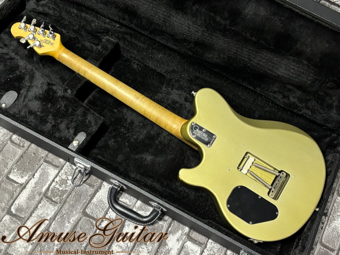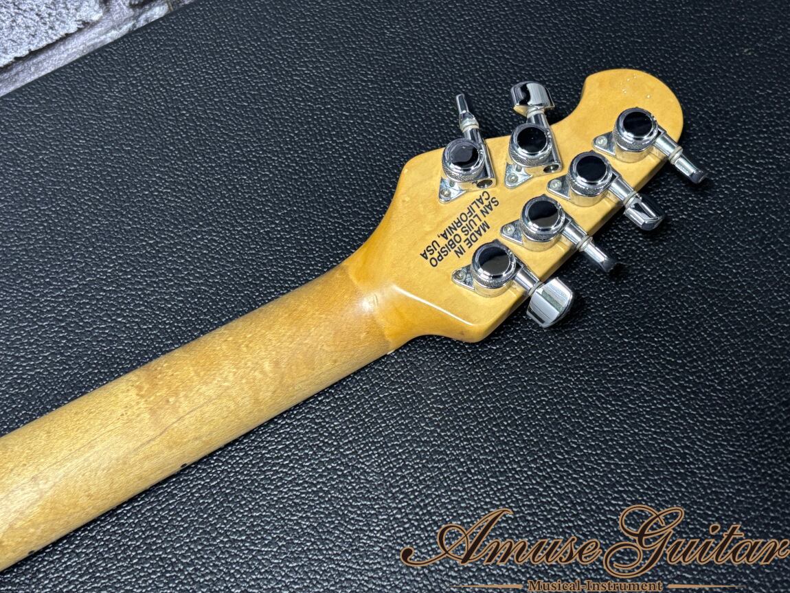 まずこちらのスペックとしましては、アッシュボディ、バーズアイ杢目も確認できる良質なメイプルネック/メイプル指板のロングスケール、約40.5mmナット幅、10R、5点止めボルトオン構造。ボディはVan Halenも愛した小ぶりで取り回しのよい絶妙なフォルム。そしてボディには中々お目にかかれないレアカラー”エジプシャンスモーク”と思われるフィニッシュを採用。コントロールとしてはマスターヴォリューム、マスタートーン、5wayピックアップセレクターのシンプルなレイアウト。その他としましてはシャーラー製ダイヤルロック式ペグ、ミュージックマン4:2オリジナルヘッドシェイプ、2点支持シンクロトレモロ、ブリッジコマにはアップグレード換装となるグラフテック素材のものとなっており弦が切れにくい効果がプラスとなった点などが挙げられます。