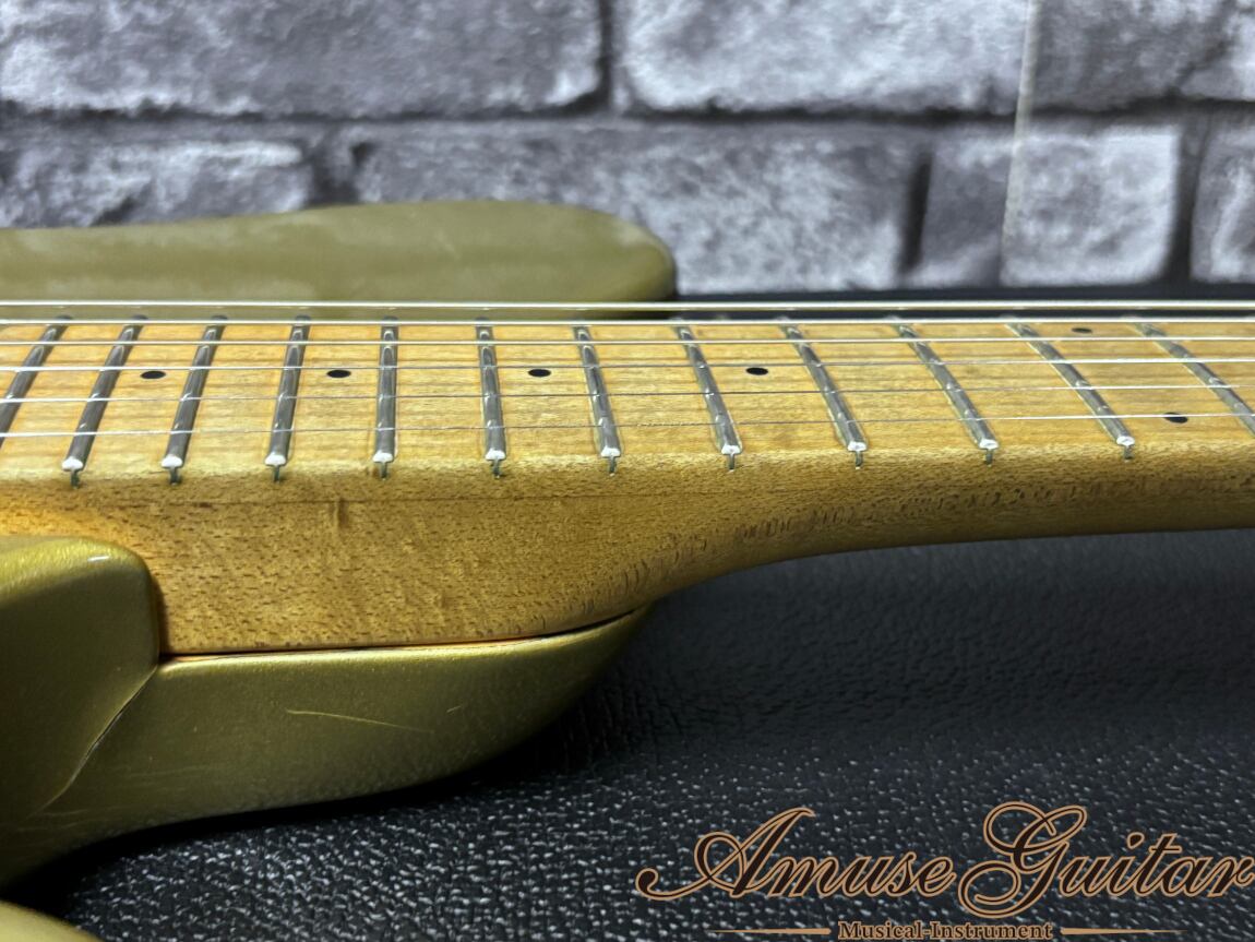 こちらの状態ですが、塗装クラック、日焼け、打痕、スレ、パーツの使用感、バックパネル欠品、一部パーツ交換(シャーラーストラップピン×2、ブリッジコマ)などがございますが、演奏面に問題のある個所はなく、ガンガン使って頂ける所謂プレイヤーズコンディションの一本となります。フレットは約6~7割程ですり合わせがされた形跡があり、凹みも無く演奏性は抜群です。トラスロッドの効きも確認済みです。付属品はアーム、ソフトケースです。※ハードケースは撮影用のものとなります。