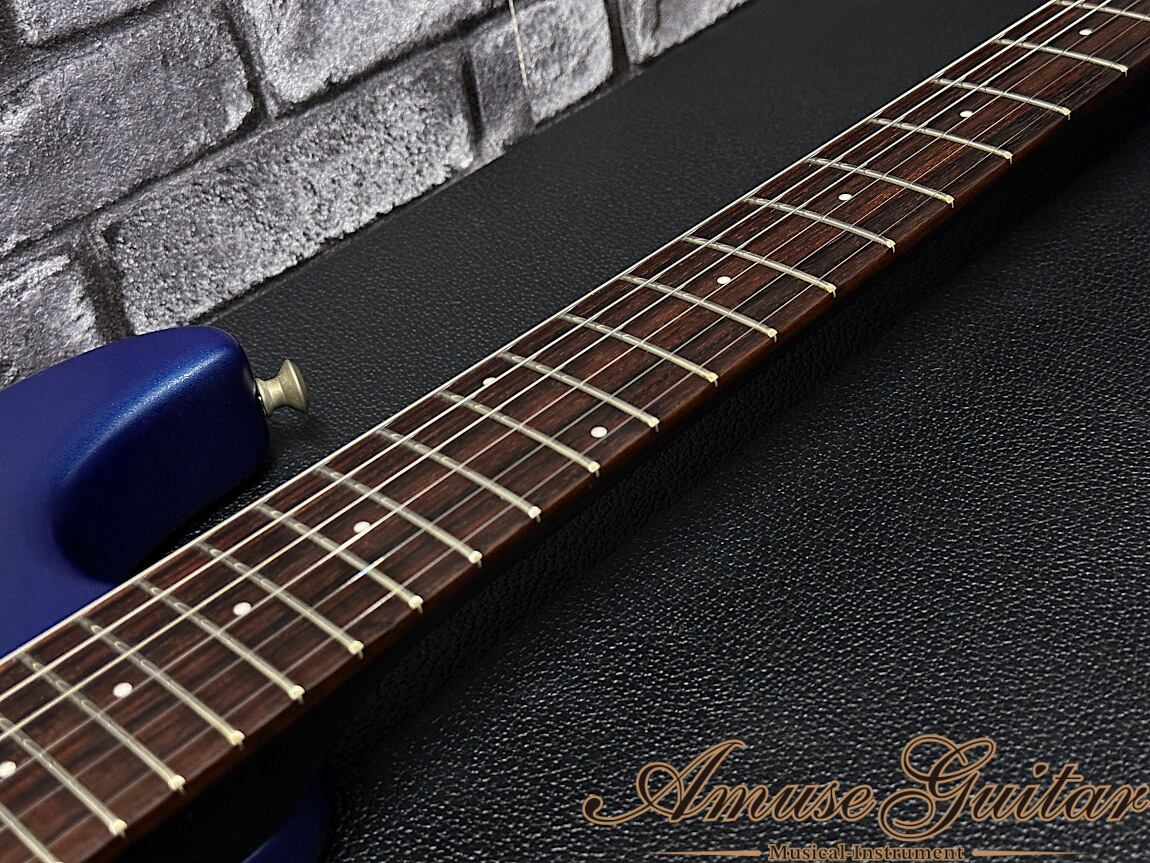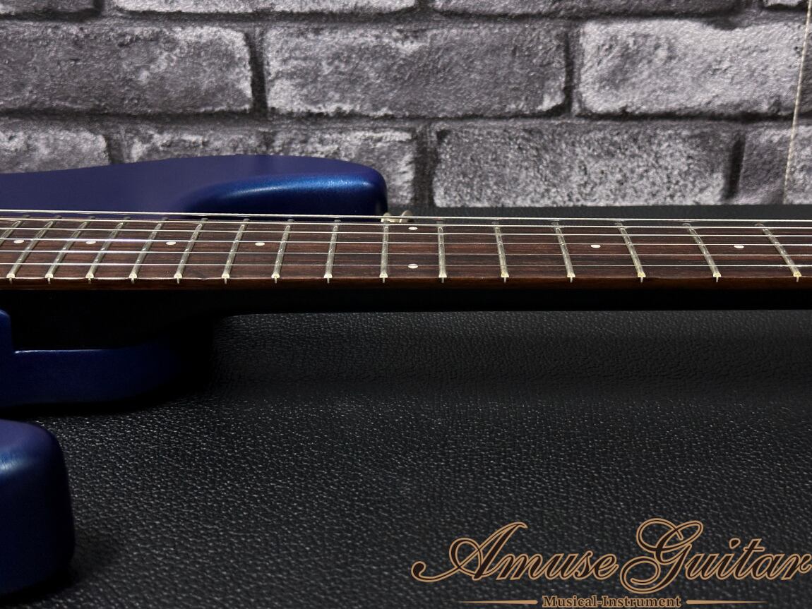 こちらのスペックですが、ボディはポプラ。ネックにはメイプル、指板にはローズウッドを採用した木材マテリアル。ロングスケール(25-1/2" scale)、約42mmナット幅、10R、22フレット、5点止めのボルトオン構造。Silhouetteを基に設定された基本スペックですが、ポプラのボディ材や、ノントレモロ(ハードテイルブリッジ)や、ピックアップセレクターに金属製トグルスイッチが採用されるなど一部Steve Morseモデルを彷彿とさせるスペックも見受けられます。大きな特徴の一つに塗装も挙げられます。艶消し仕上げの塗装で、濃い青色~紺色のようなどのギターとも似つかない存在感を放つフィニッシュとなっており、コストパフォーマンスモデルに有りがちな安っぽさは一切感じません。その他としましてはストラップピンがダンロップロック式対応のものになっております。